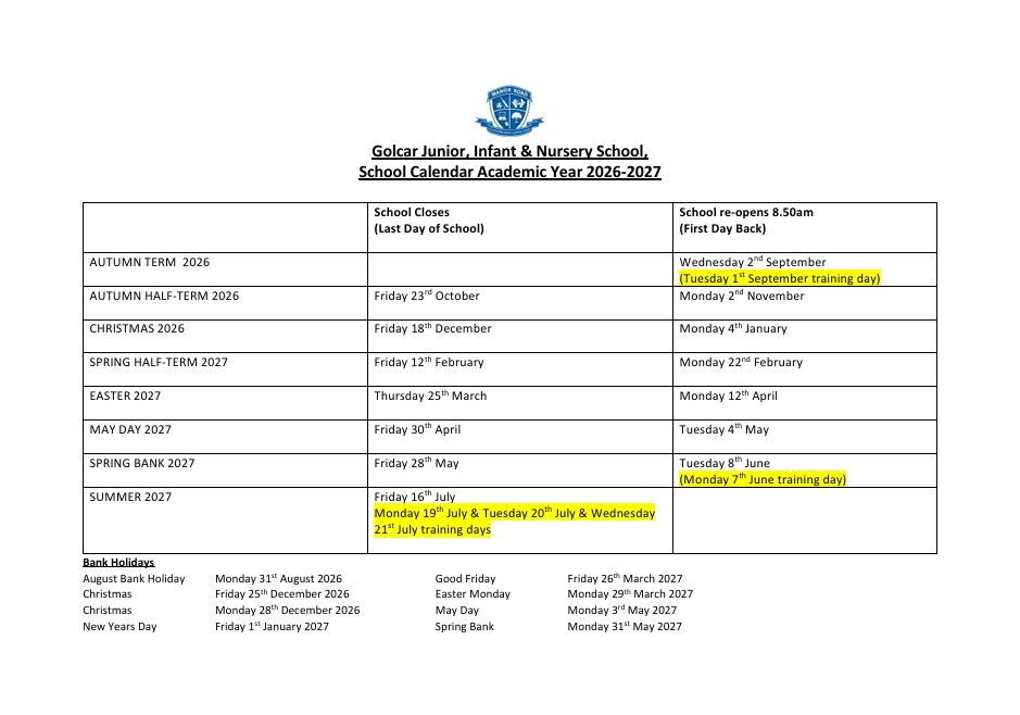 Academic Calendar 2026/27 at Golcar JIN